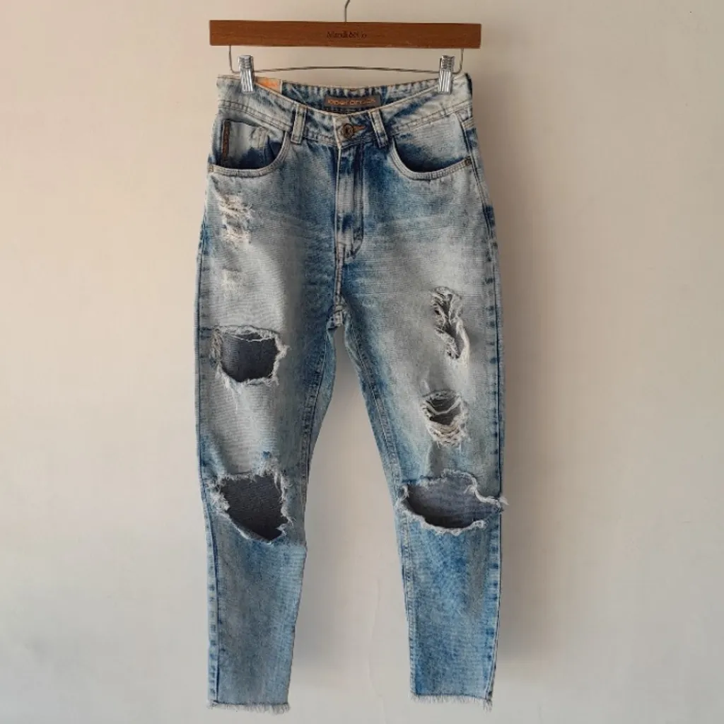 opera rock 36 medidas: compr 96cm cint 70cm quadril 98cm gancho 30cm material: algodão e elastano descrição: calça boyfriend cintura alta destroyed barra desfiada cor: azul claro