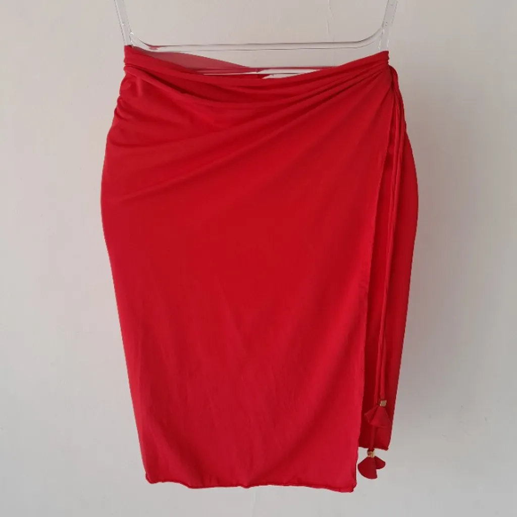 saia envelope saída de praia vermelha marca: hope resort tam: m compr 53cm largura total 120cm poliamida e elastano (06/02) canga saída de banho biquini maiô pareô saia transpassada