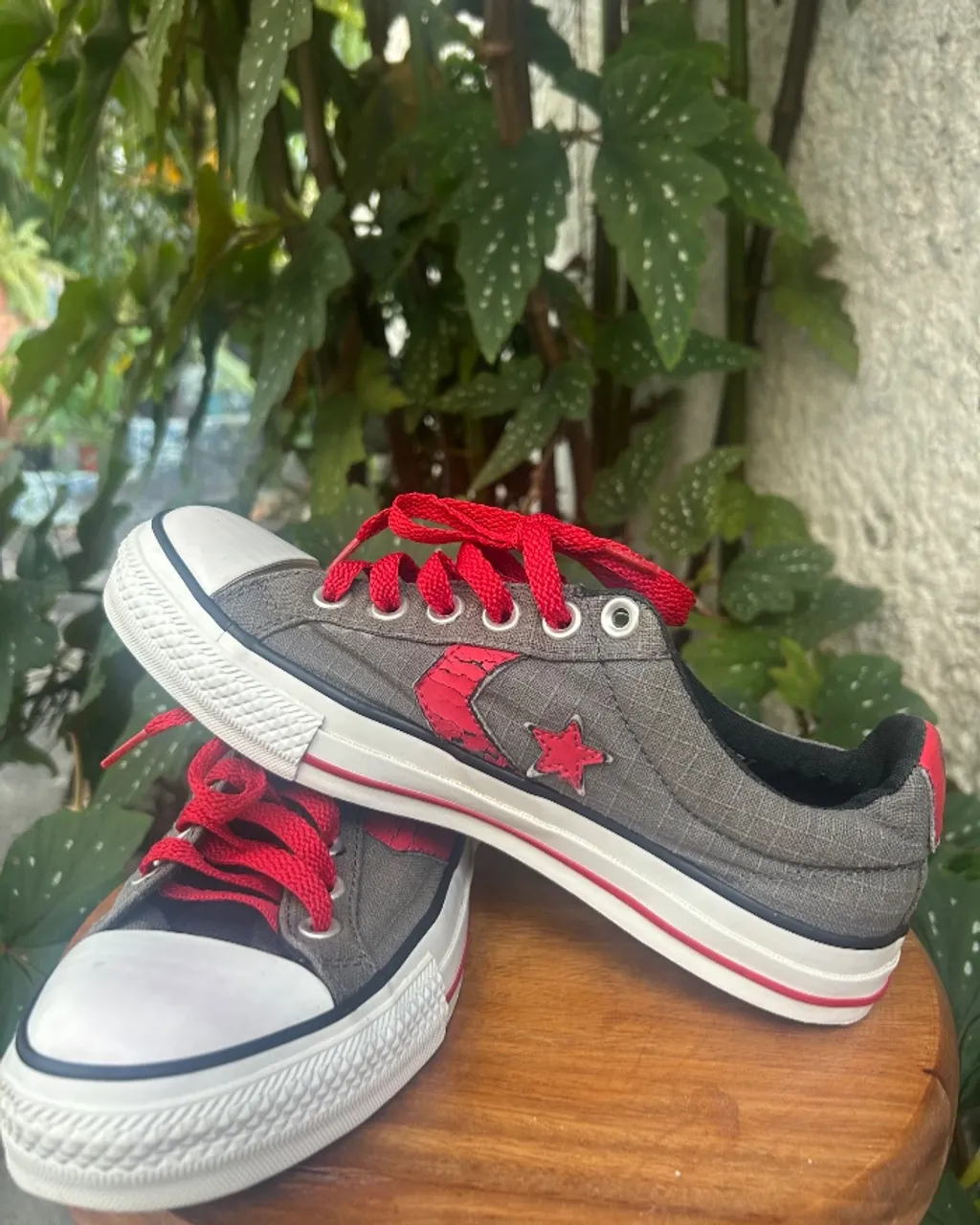 Relíquia Converse! Linha "Est. 1977" com logo Star & Chevron em relevo. Tecido Ripstop cinza ultra resistente (não rasga!) e detalhes em vermelho neon. Solado premium com revestimento têxtil (aderência top). Cadarços largos originais. Solado intacto, apenas leve craquelado no detalhe vermelho.