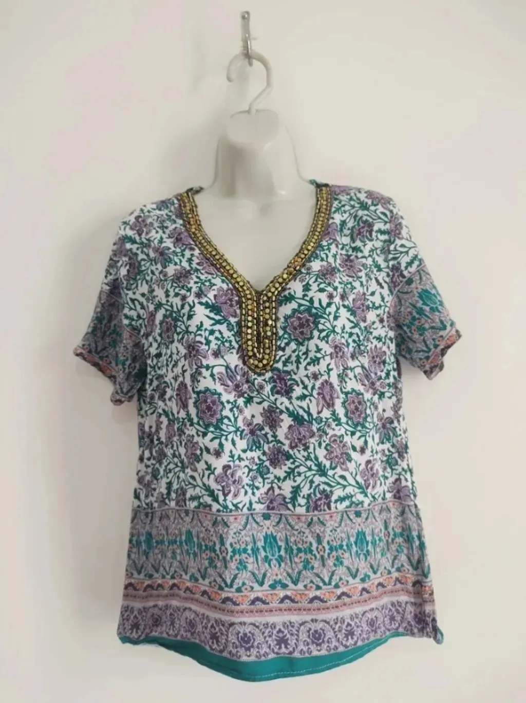 CONFIRA AS MEDIDAS ABAIXO: Possui gola v adornada com pedraria e manga curta. Usada, porém em excelente estado de conservação. Tamanho: G na etiqueta, mas veste M Tecido: Viscose Marca: Carmelo Condição da peça: 10/10 Medidas: Busto: 100cm Cintura: 94cm Comprimento: 62cm