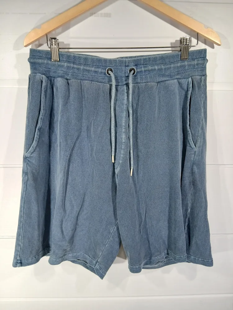 bermuda led, tipo moleton tamanho g, na cor azul. possui cós elástico com cordão para ajuste, bolsos laterais e traseiro. ideal para o dia a dia, proporcionando conforto e estilo.