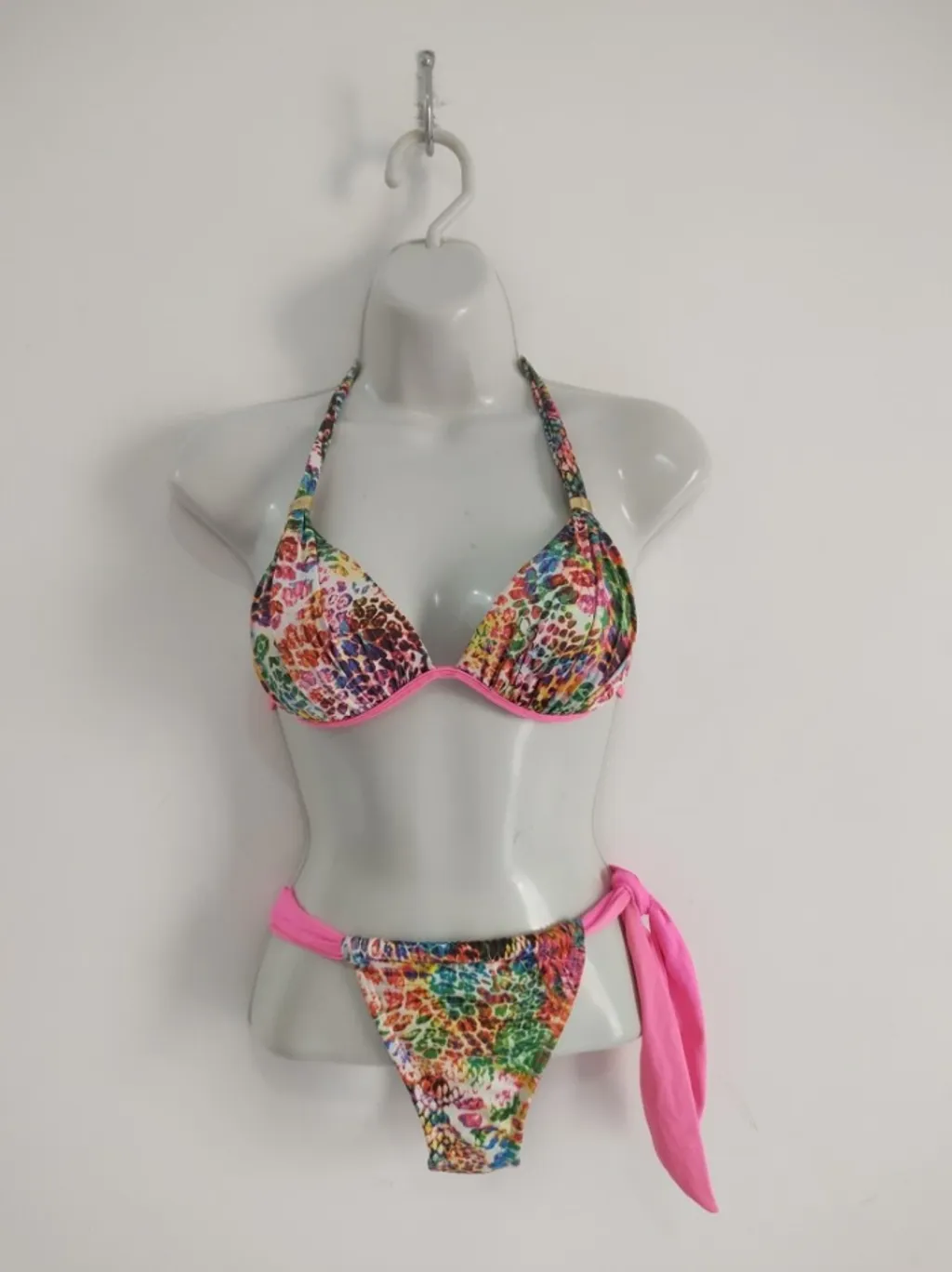 CONFIRA AS MEDIDAS ABAIXO: Conjunto de biquíni com estampa colorida e vibrante, possui top cortininha com bojo, amarração no pescoço e nas costas . A calcinha possui lateral com amarração. Usado, porém em excelente estado de conservação. Tamanho: M na etiqueta, mas veste P Tecido: Poliéster e elastano Condição da peça: 10/10 Medidas: Busto: veste até sutiã 42 Calcinha: veste até manequim 38
