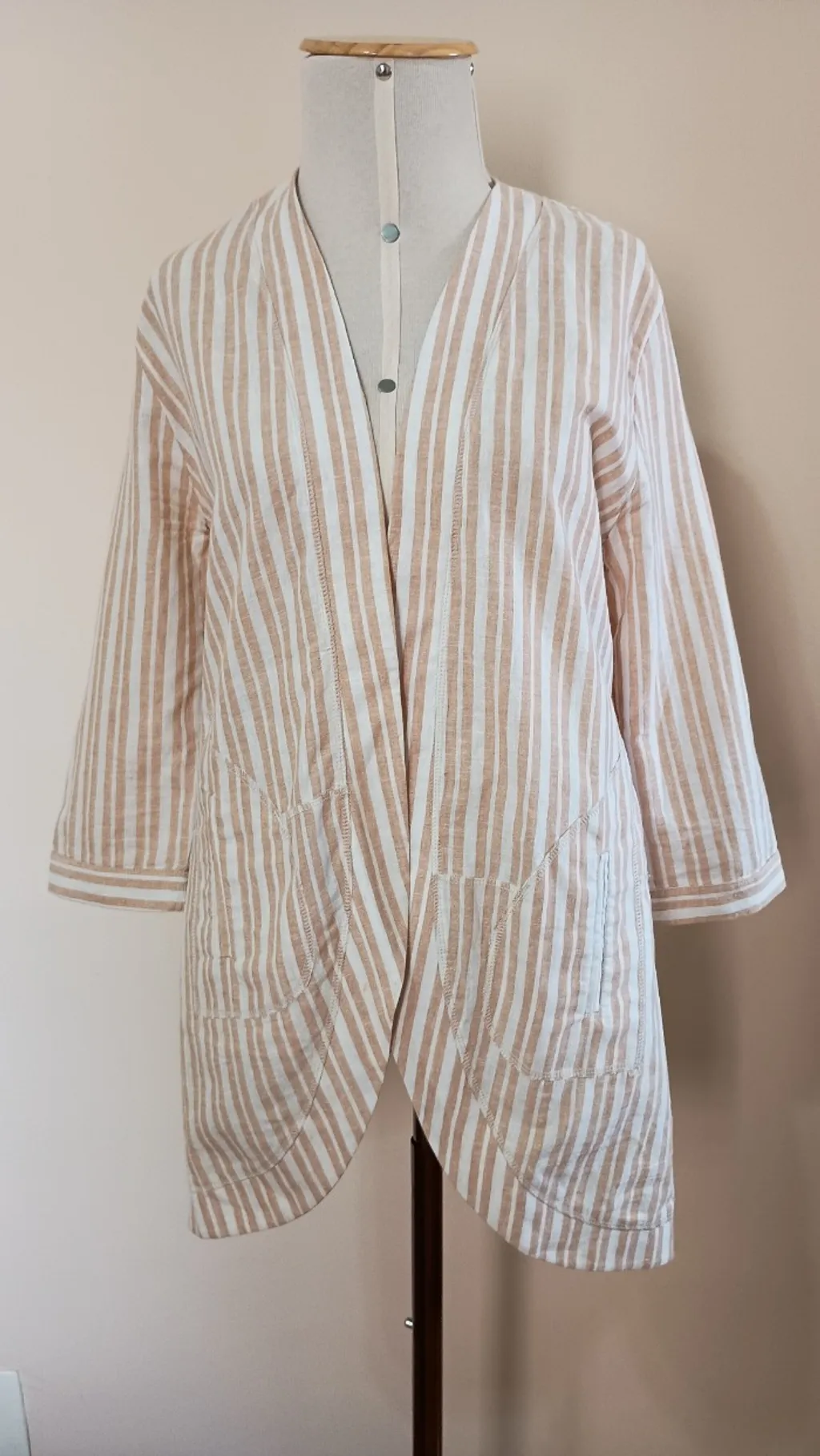 Blazer estilo kimono feito em linho e algodão, tamanho p. possui dois bolsos frontais. tem 78 cm de comprimento, 40 cm de ombro, 48 cm de manga, 92 cm de busto e 88 cm de cintura.