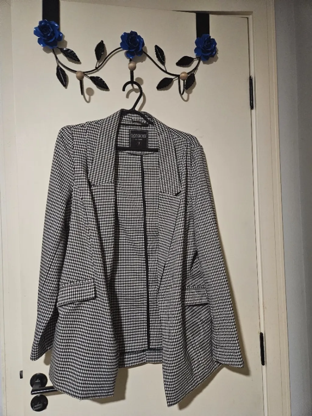 blazer com estampa pied de poule, que nunca sai de moda! tamanho p, com bolsos funcionais e botões nas mangas, para dobrá-las