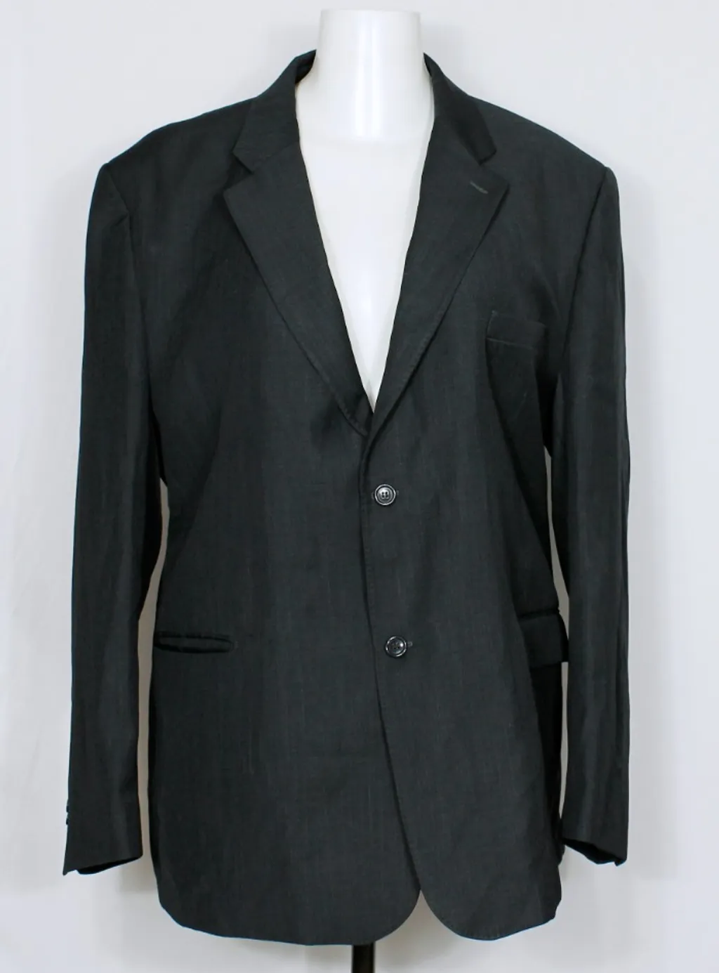 Cor: preto puxado para um cinza Tecido: poliviscose Composição: 85% poliéster e 15%viscose Modelo: masculino, plus size, longo Bolsos: sim Forro: sim Manga: longa Ombreiras: sim Peça em perfeitas condições e sem avarias. Tamanho 60L (favor verificar as medidas): Medidas: Ombros: 56 cm Busto (circunferência): 138 cm Cintura (circunferência): 130 cm Comprimento da manga: 70 cm Comprimento da peça: 87 cm