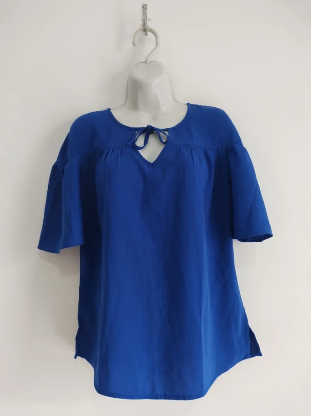 CONFIRA AS MEDIDAS ABAIXO: Possui gola amarração e detalhe vazado, manga curta, pequena fenda nas laterais e modelagem solta. Usada, porém em excelente estado de conservação. Tamanho: GG Cor: Azul royal Tecido: Poliéster Condição da peça: 10/10 Medidas: Busto: 116cm Cintura: 110cm Comprimento: 66cm