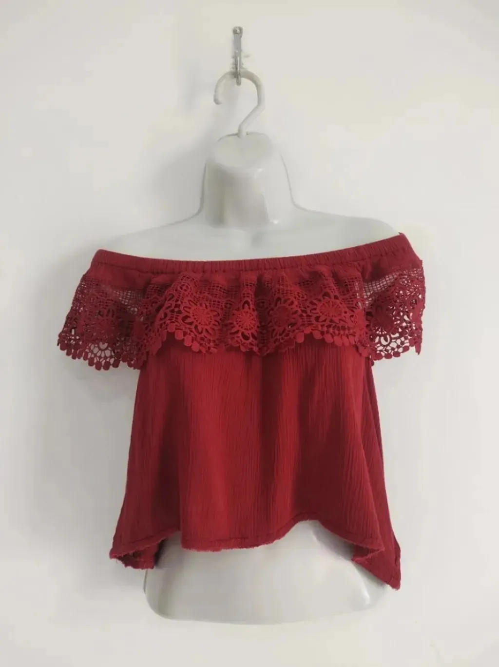 CONFIRA AS MEDIDAS ABAIXO: Possui gola ombro a ombro com renda guipir e ajuste de elástico. Usada, porém em excelente estado de conservação. Tamanho: M Cor: Marsala Tecido: sem etiqueta, parece algodão Marca: Yun.Shang Condição da peça: 10/10 Medidas: Busto: 100cm Cintura: 100cm Comprimento: 40cm