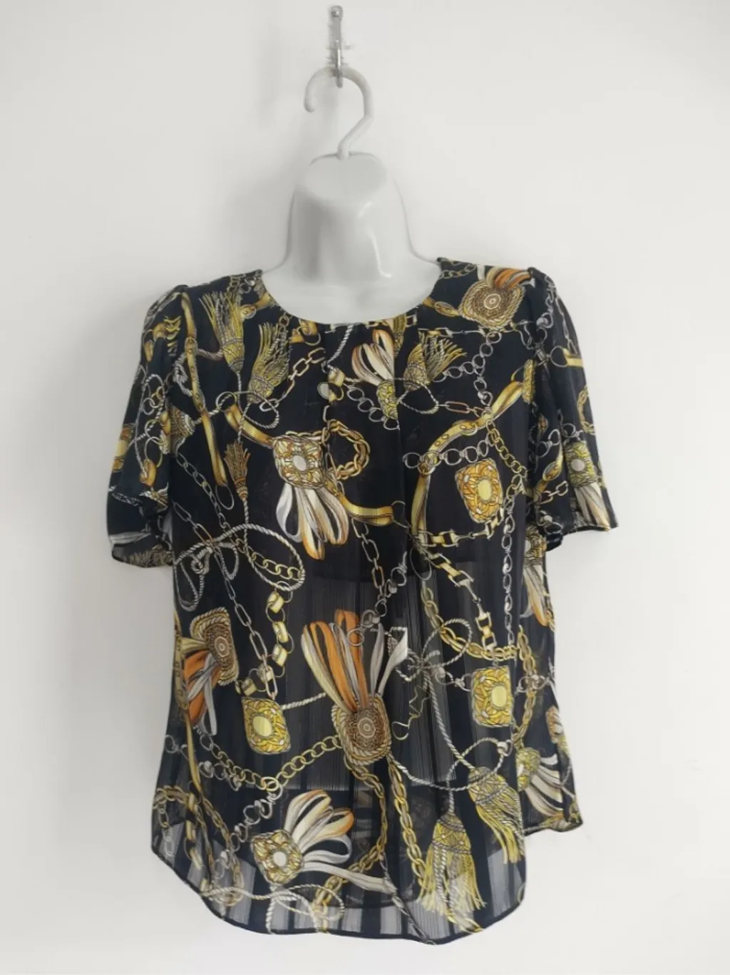 CONFIRA AS MEDIDAS ABAIXO: Possui gola redonda, manga curta, brilho com fios dourados e transparência. Usada, porém em excelente estado de conservação. Tamanho: P Cor: Preto, amarelo e dourado Tecido: Poliéster Marca: Dommo Condição da peça: 10/10 Medidas: Busto: 94cm Cintura: 92cm Comprimento: 58cm