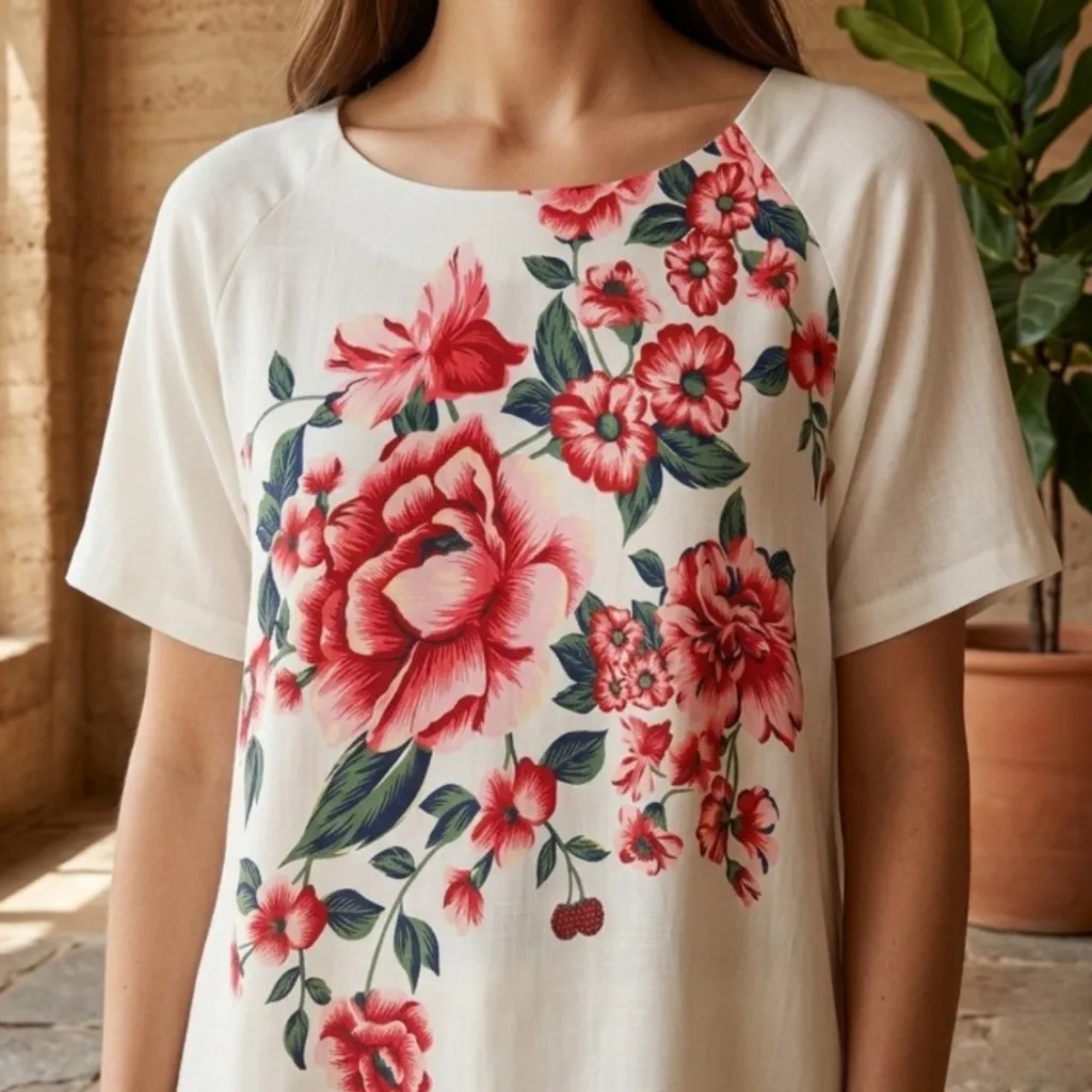 Blusa Farm em viscose cor creme com estampa floral. Manga curta. Veste P / Condição 8/10 86cm busto e 53cm comprimento.