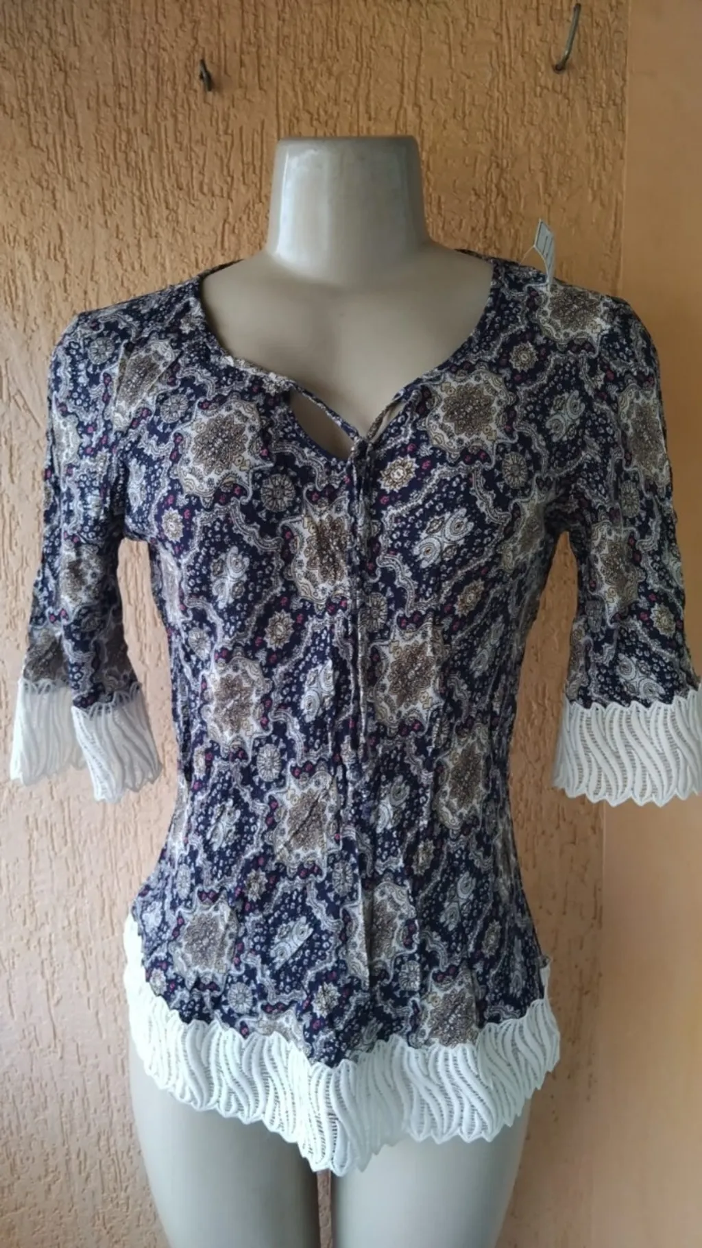 Linda blusa feminina modelo ciganinha, ideal para quem busca um visual delicado e fresquinho. A peça possui detalhes trabalhados em renda guipir nas extremidades das mangas e na barra, conferindo um acabamento sofisticado e romântico. 🎀 ✅ Especificações: Modelo: Ciganinha com amarração no decote. Detalhes: Barrados em Guipir branco. Tamanho: M. Estado: Excelente conservação. Perfeita para combinar com jeans ou saias em dias de sol. Aproveite esta oportunidade! 🌟