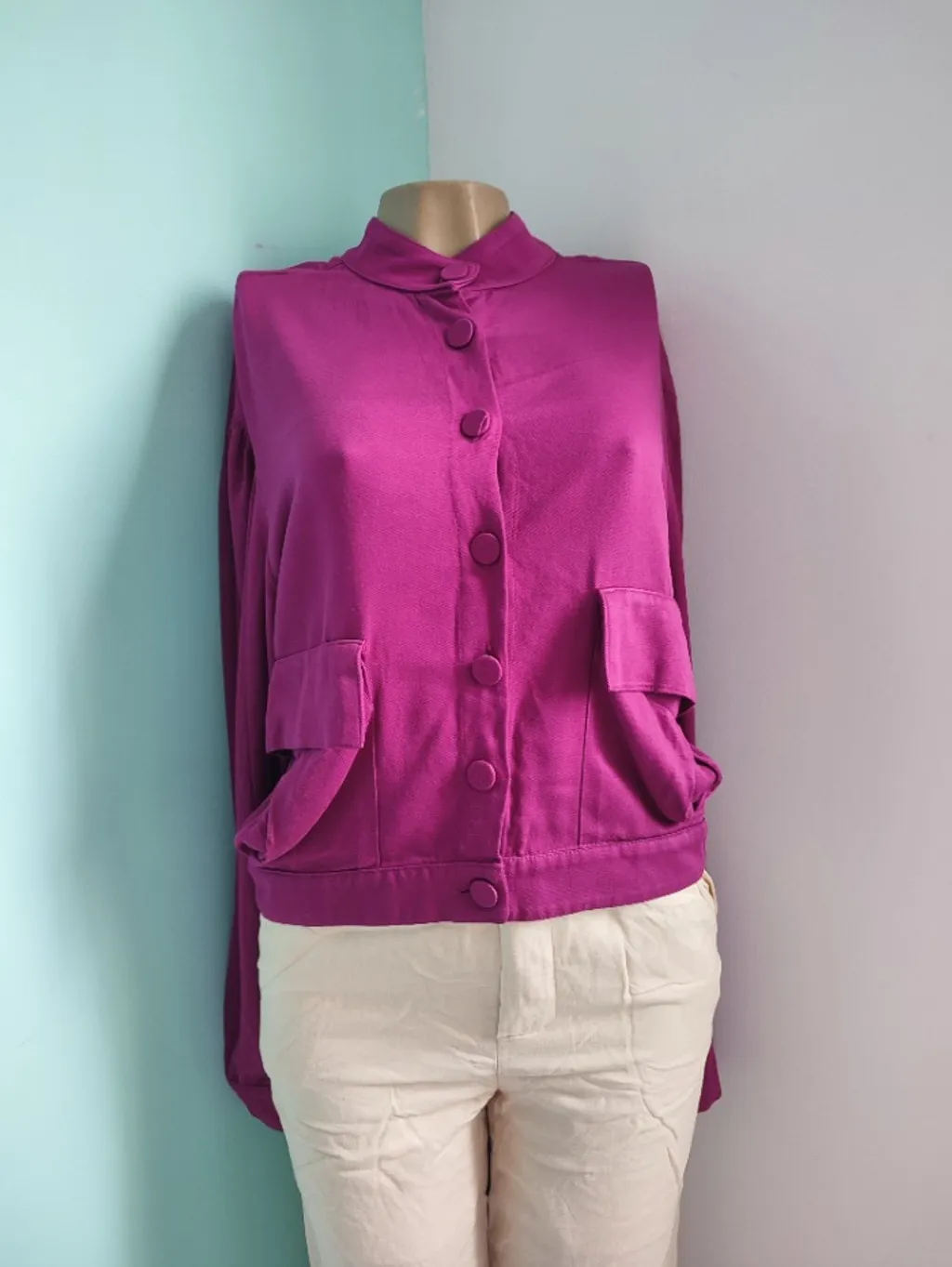 Essa blusa verde vibrante é uma peça moderna que mistura elegância e um toque artesanal. Com um decote em V marcante e mangas 3/4 levemente bufantes, o grande destaque são os bordados em tons de azul e roxo que adornam as mangas, criando um contraste sofisticado.