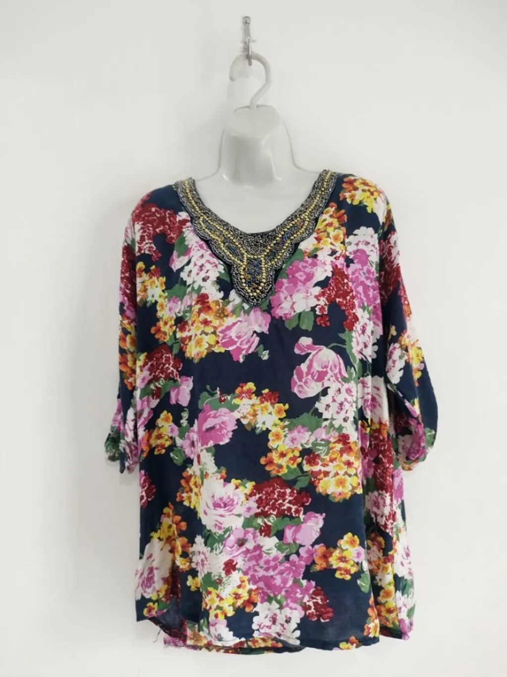 CONFIRA AS MEDIDAS ABAIXO: Possui gola v adornada com pedraria, mangas 7/8 dobrada e estampa floral. Usada, porém em excelente estado de conservação. Tamanho: G Tecido: Viscose Marca: Queen Wardrobe Condição da peça: 10/10 Medidas: Busto: 110cm Cintura: 112cm Comprimento: 70cm Comprimento manga: 42cm