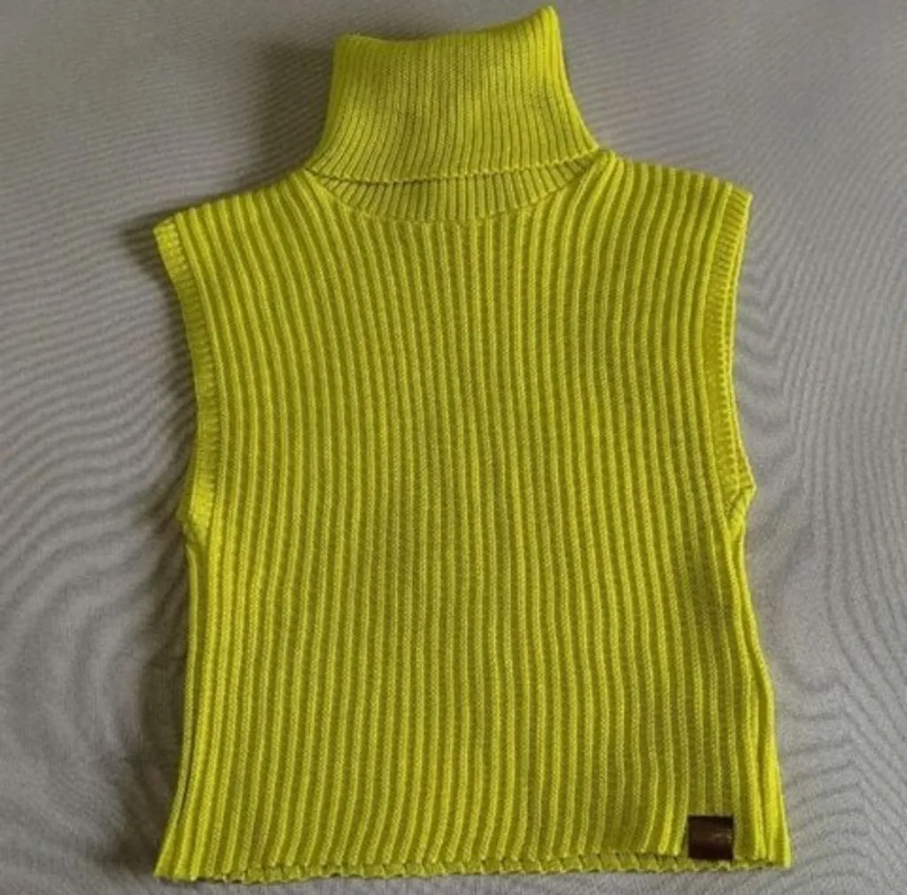 Blusa Lança perfume, tricô verde canelada. Modelo gola alta e manga cavada. Novíssima.