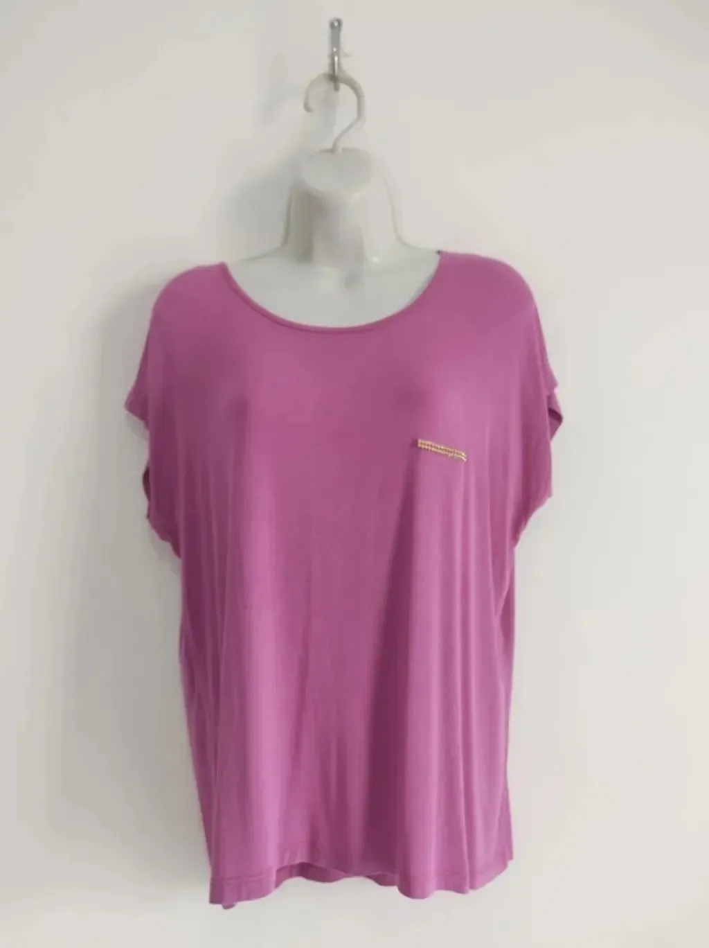 CONFIRA AS MEDIDAS ABAIXO: Possui gola redonda, manga curta e detalhe de strass no peito esquerdo. Usada, porém em excelente estado de conservação. Tamanho: G Cor: Magenta Tecido: Viscose e elastano Marca: JRA Condição da peça: 10/10 Medidas: Busto: 110cm Cintura: 98cm Comprimento frontal: 62cm Comprimento traseiro: 69cm