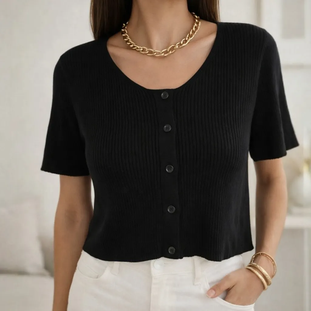 Blusa cropped preta de malha canelada A.Brand, possui botões falsos. Veste P / Condição 9/10 / 70% viscose e 30% poliamida. 68-88cm busto e 43cm comprimento