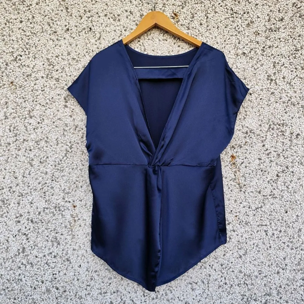Blusa manga curta azul marinho, com decote v transpassado. Possui caimento solto e tecido acetinado. Marca Shein Curve, tamanho 1XL(veste um pouquinho mais que GG, confira medidas). Medidas: 106cm busto / 100cm cintura / 80cm comprimento na parte mais longa.