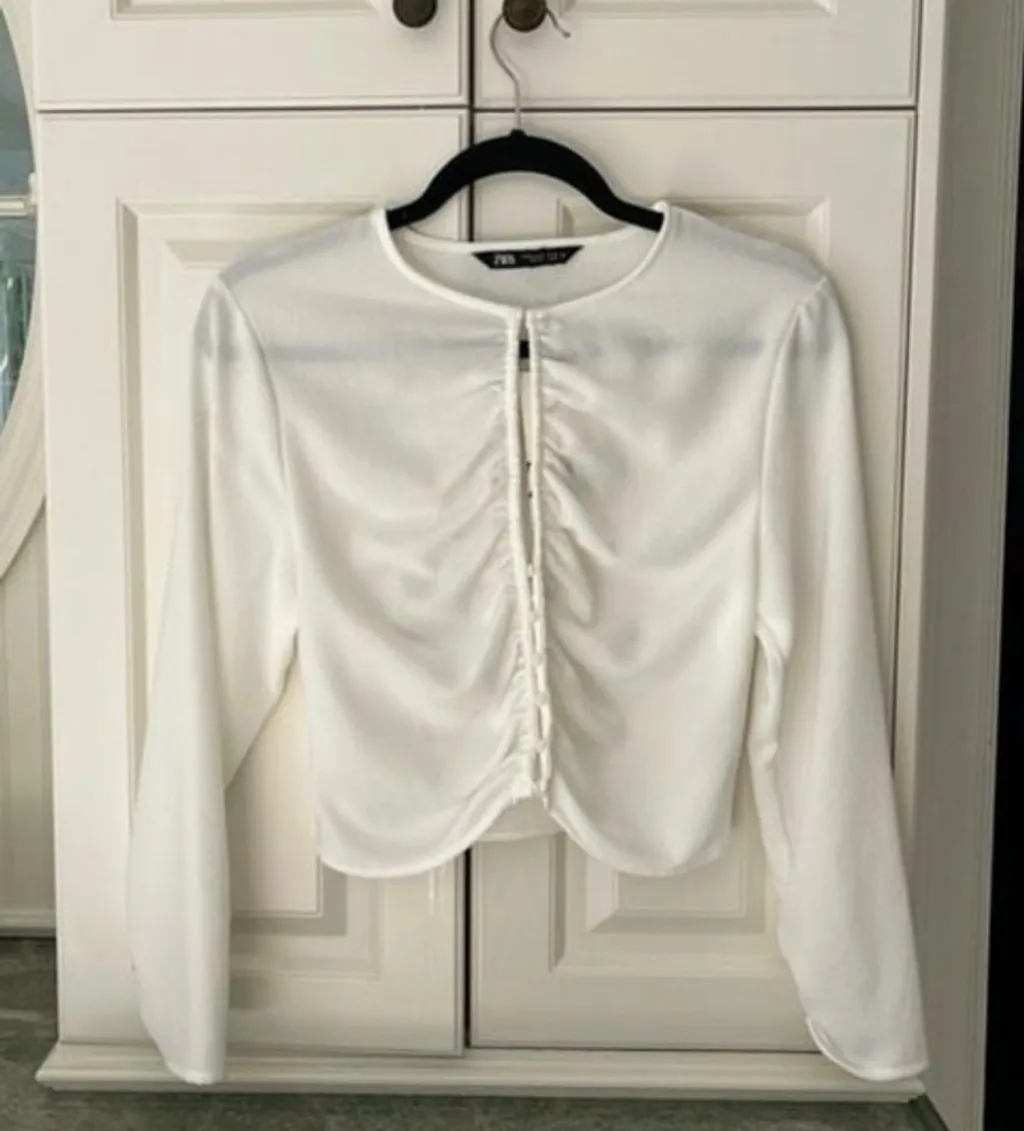 Blusa Zara, branca/off white com botões, fica um leve decote nos seios. Linda e veste muito bem. Made in Vietnam.