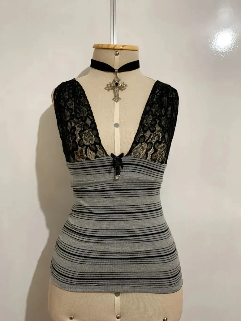 Blusinha cinza listrada com alcinhas rendadas - tamanho PP a P
