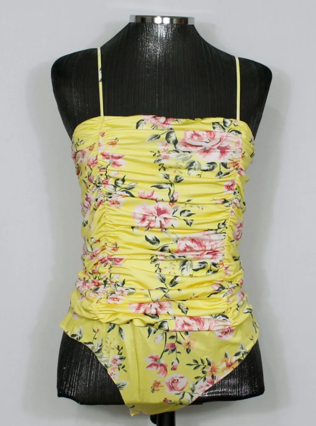 Cor: amarelo com estampado floral de rosas Tecido: malha fria acetinada, estica Modelo: feminino Forro: sim Manga: as alças possuem ajuste Marca: Lança Perfume Peça em perfeitas condições e sem avarias. Veste G (favor verificar as medidas): Medidas: Busto (circunferência): 84 cm Cintura (circunferência): 76 cm Comprimento da peça: 62 cm