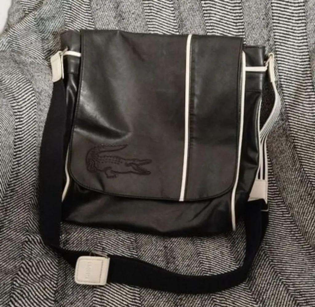 Bolsa carteiro vintage, Lacoste (original) em couro preto. Modelo transversal com alça regulável. Altura: 38 cm Largura: 38 cm.