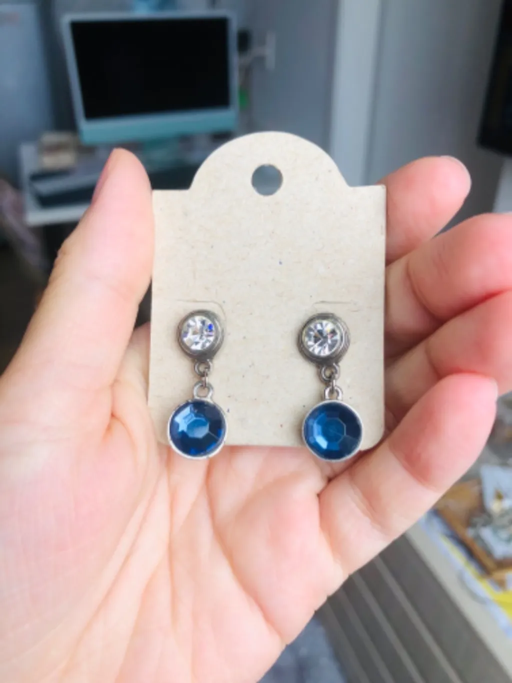 Brinco pequeno, novo, levinho, strass com pedra azulada, bijuteria, marca Mygloss