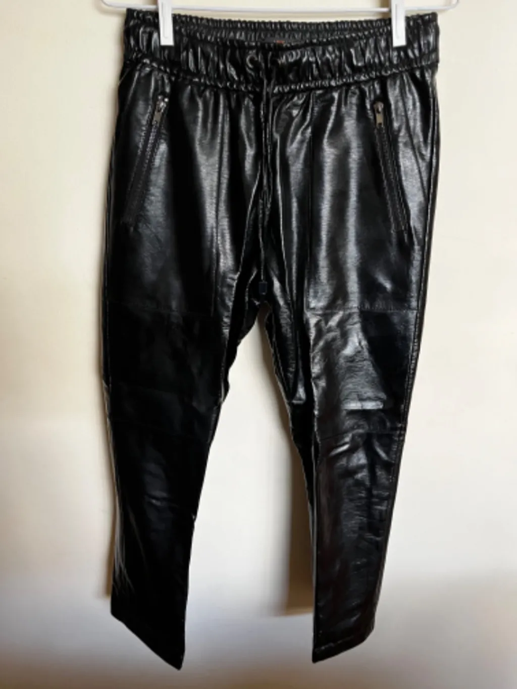 calça Animale, 100% viscose, revestido com 100% poliuretano, em perfeito estado de conservação. Dois bolsos com fechamento em zíperes na frente e 2 bolsos atrás. Cintura com elástico e amarração. Medidas: 90 cm de comprimento 74 cm de cintura e 102 cm de quadril