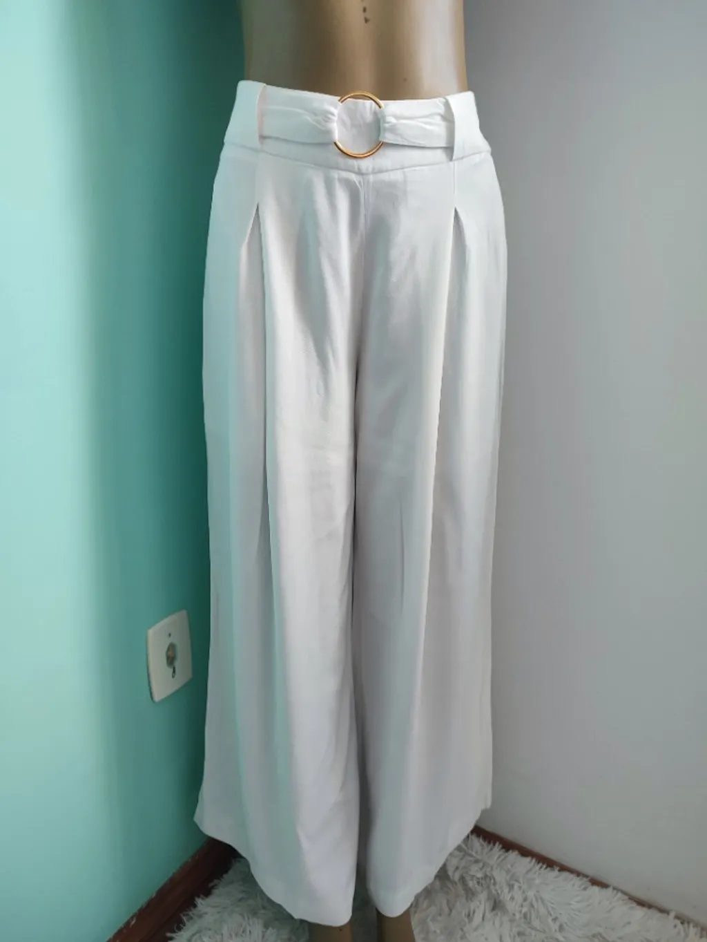 calça pantalona branca de alfaiataria com cinto de fivela circular.