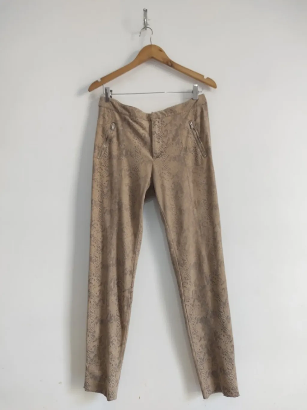 CONFIRA AS MEDIDAS ABAIXO: Possui cintura alta, fechamento com zíper e colchetes, bolsos não funcionais, estampa de cobra e modelagem skinny. Usada, porém em excelente estado de conservação. Tamanho: 44 Cor: Bege Tecido: Camurça Marca: Zara Condição da peça: 10/10 Medidas: Cintura: 88cm Quadril: 104cm estica até 114cm Coxa: 60cm estica até 66cm Comprimento: 98cm Gancho: 26cm