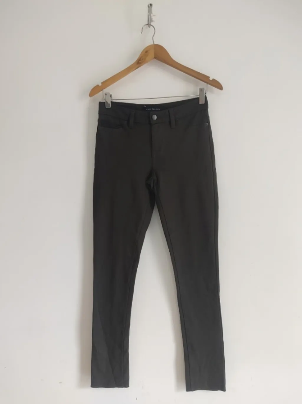CONFIRA AS MEDIDAS ABAIXO: Possui cintura média para baixo, fechamento com zíper e botão, bolsos traseiros e modelagem justa. Usada, porém em excelente estado de conservação. Tamanho: P Cor: Cinza escuro Tecido: Viscose, poliamida e elastano Marca: Calvin Klein Condição da peça: 10/10 Medidas: Cintura: 72cm estica até 80cm Quadril:90cm estica até 100cm Coxa: 50cm estica até 60cm Comprimento: 95cm Gancho: 22cm