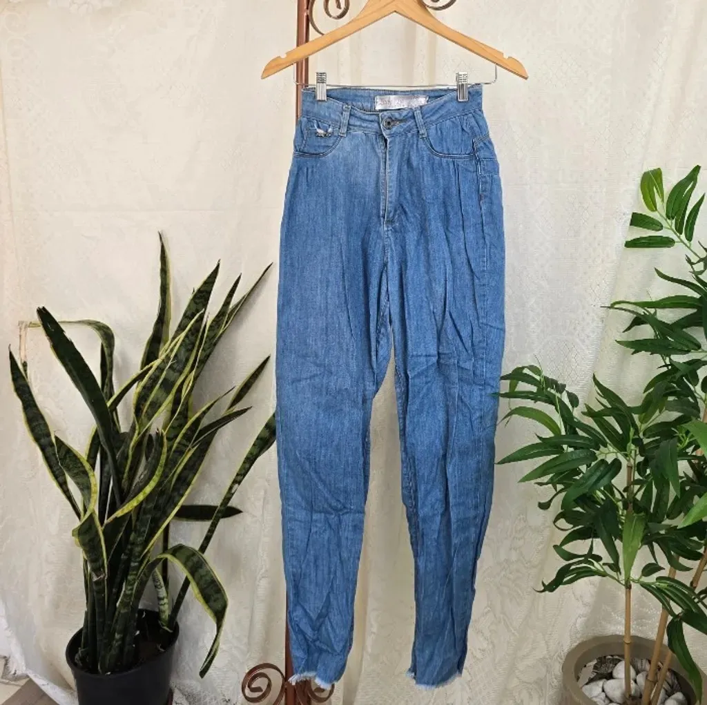 Calça jeans estilo carrot, com cintura alta, desfiados na barra, elástico na cintura, passantes para cinto, bolsos frontais falsos e traseiros funcionais. Lady Lu / 97% algodão e 3% elastano / 38 na etiqueta mas veste melhor 36 / Condição 8/10 (desbotamento da cor em geral). 56-64cm cintura, 29cm gancho, 92cm quadril e 103cm comprimento.