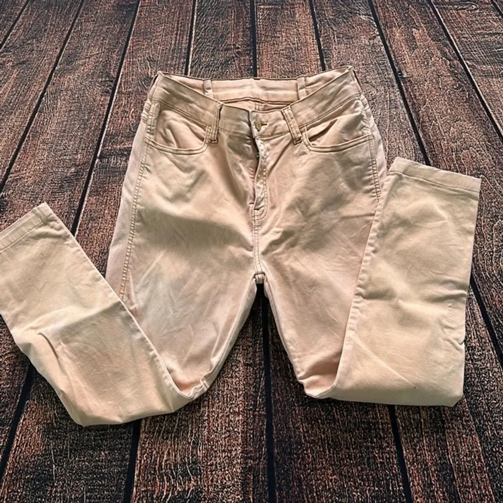 Calça jeans feminina bege/marrom claro, modelo ajustado ao corpo.