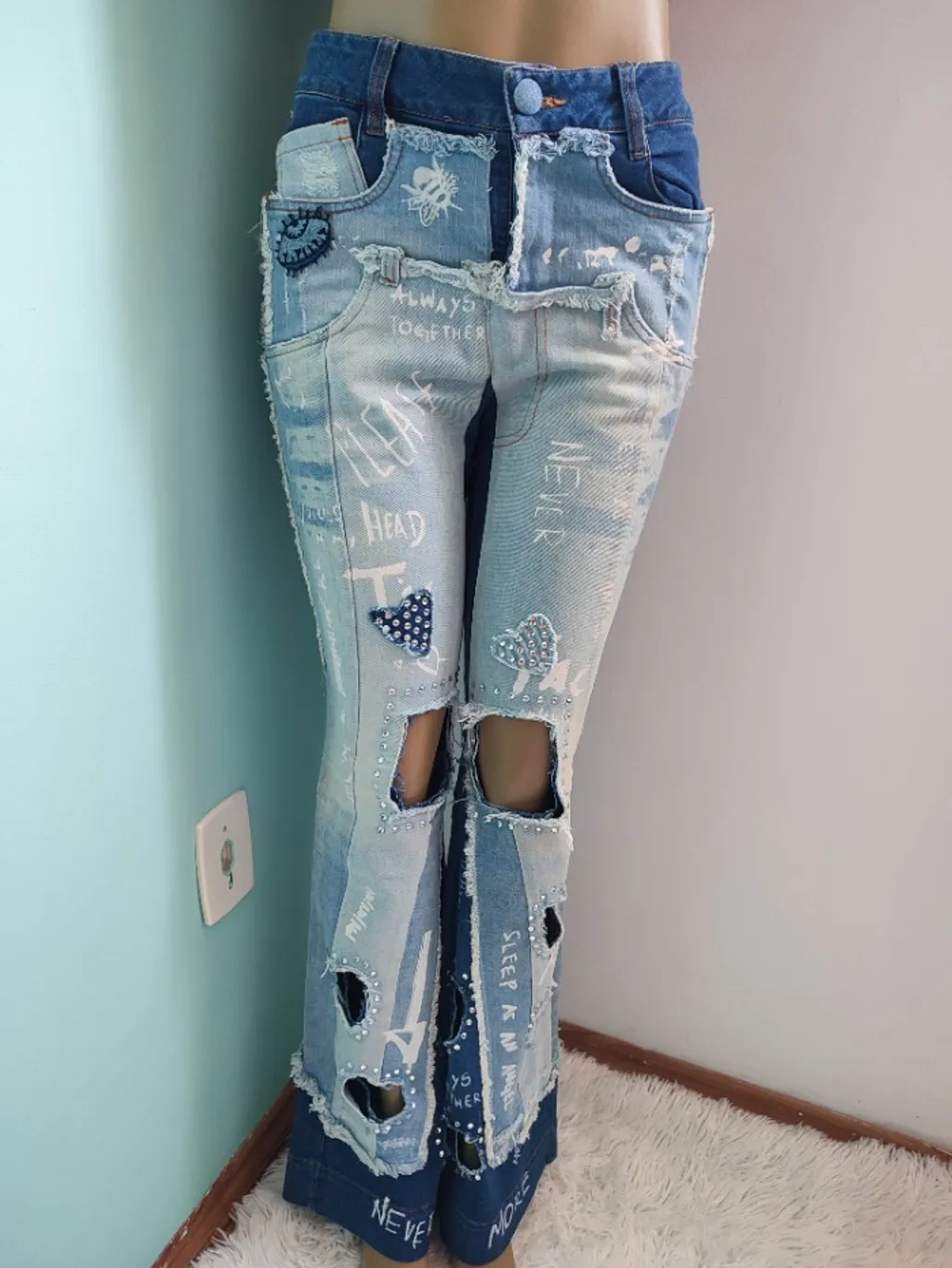 Calça modelo flare da marca Tigresse, conhecida pelo estilo patchwork e design customizado. O design se destaca pela mistura de diferentes tons de jeans e detalhes "destroyed", como rasgos nos joelhos e barras desfiadas.