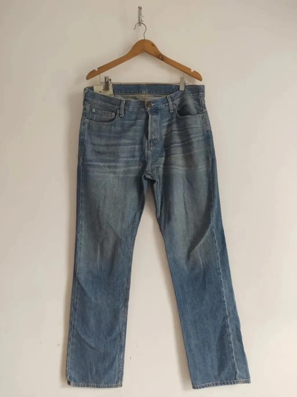 CONFIRA AS MEDIDAS ABAIXO: Possui cintura alta, fechamento com botões, bolsos funcionais, passantes para cinto, bolsos funcionais e caimento reto. Usada, porém em excelente estado de conservação. Tamanho: W34m veste 44 Tecido: Denim Marca: Hollister Condição da peça: 10/10 Medidas: Cintura: 94cm Quadril: 110cm Coxa: 62cm Comprimento: 107cm Gancho: 29cm