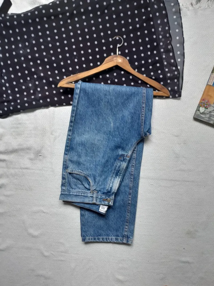 calça jeans us top, tamanho g (veste 44), na cor jeans claro. possui corte reto e cintura média. peça usada, em ótimo estado de conservação, com marcas de uso natural do jeans.