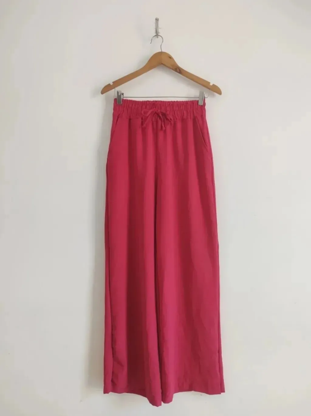 CONFIRA AS MEDIDAS ABAIXO: Possui cintura alta com ajuste de elástico e detalhe de amarração, bolsos laterais e perna larga. Usada, porém em excelente estado de conservação. Tamanho: M Cor: Pink Tecido: Poliéster Marca: Y&X Condição da peça: 10/10 Medidas: Cintura: 66cm estica até 84cm Quadril: 108cm Coxa: 65cm Comprimento: 100cm Gancho: 33cm