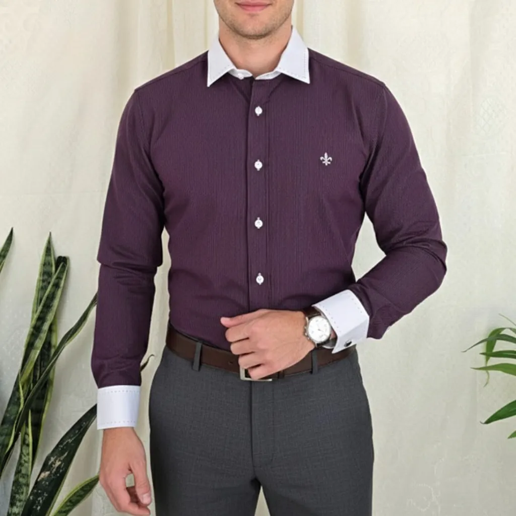 Camisa roxa e preta listrada com gola e punhos brancos. 100% algodão egípcio. Modelo com manga longa, bordado com logo da marca e abotoamento frontal e nos punhos. Dudalina / Veste P/2 / Condição 9/10. 44cm ombro a ombro, 100cm de largura (axila a axila), 63cm manga e 71cm comprimento.