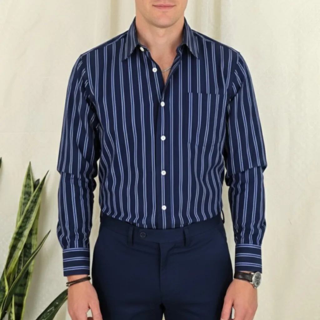 Camisa azul listrada de algodão (extra cotton, qualidade superior). Modelo com manga longa, bolso funcional e abotoamento frontal e nos punhos. Empório Colombo / Veste M/G/ Condição 9/10. colarinho 39cm, 44cm ombro, 102cm circunferência (axila a axila), 60cm manga e 70cm comprimento.