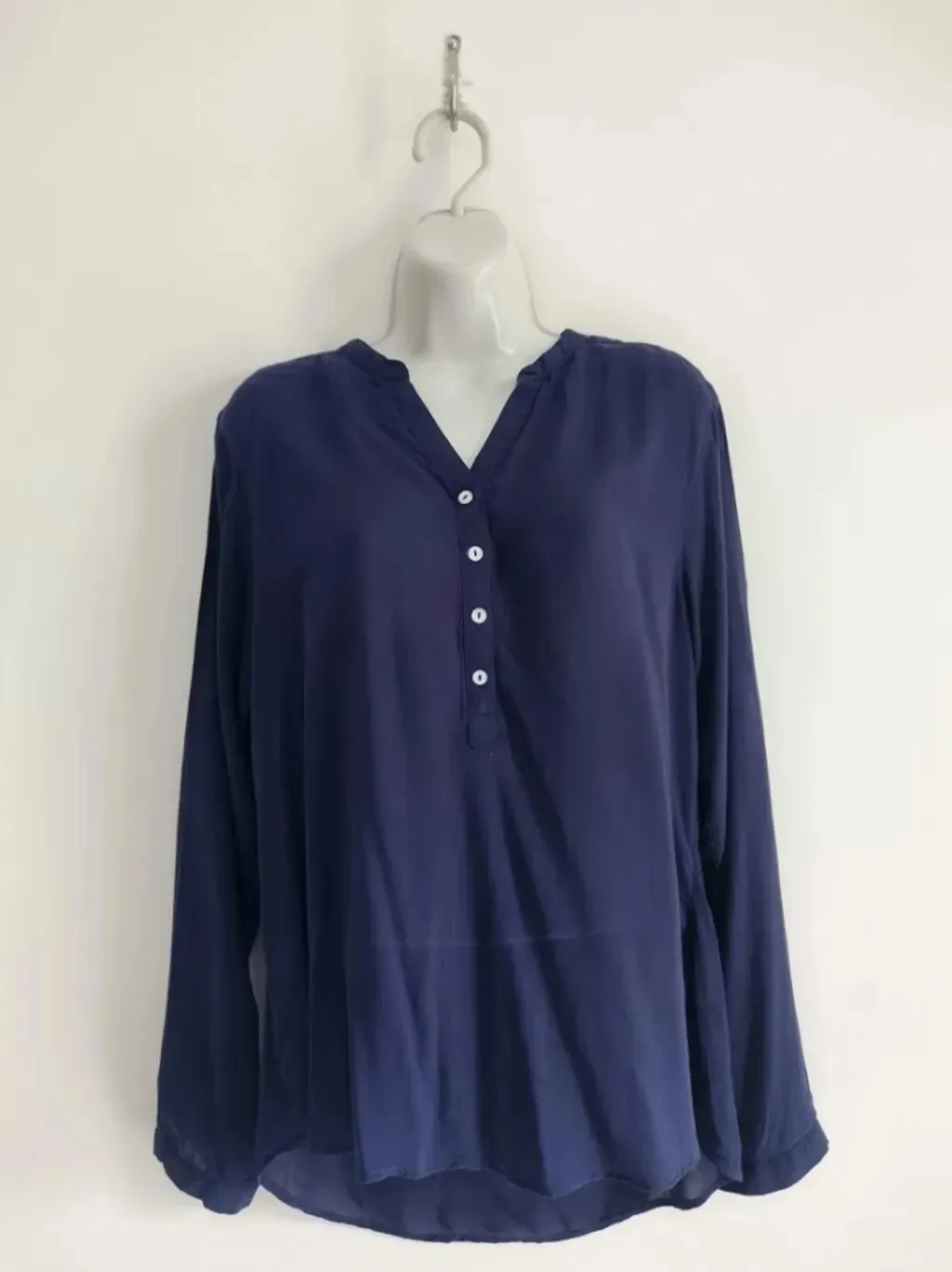 CONFIRA AS MEDIDAS ABAIXO: Possui gola v, fechamento com quatro botões e manga longa. Usada, porém em excelente estado de conservação. Tamanho: 42 veste M Cor: Azul marinho Tecido: Viscose Marca: Marisa Condição da peça: 10/10 Medidas: Busto: 102cm Cintura: 102cm Comprimento frontal: 65cm Comprimento traseiro: 74cm Comprimento manga: 62cm