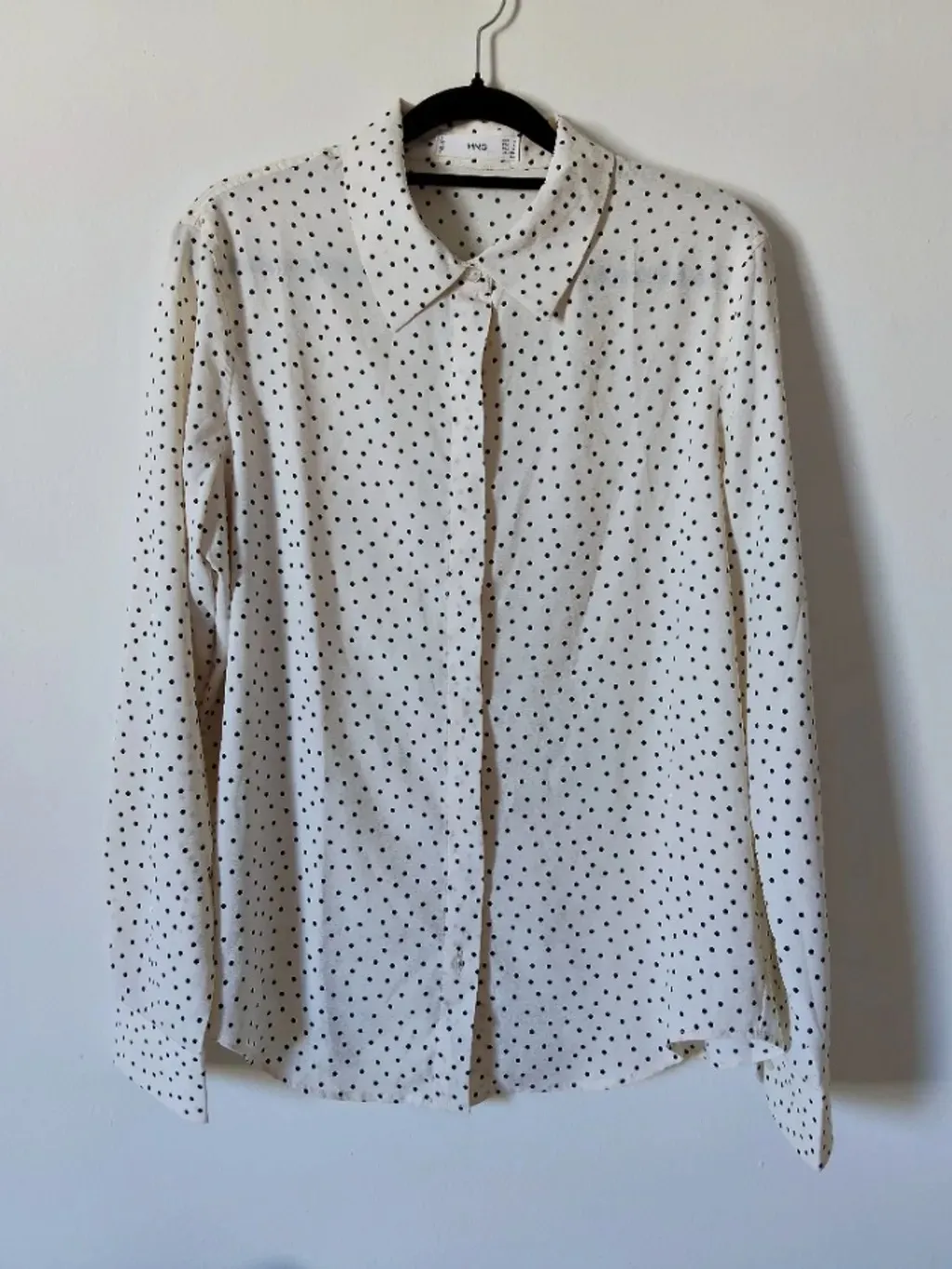 camisa branca com poá preto, usada duas vezes, tamanho m, da mango, de viscose, está como nova! medidas: 41 cm de ombro 106 cm de peito 108 cm de cintura 65 cm de comprimento 60 cm de comprimento de manga
