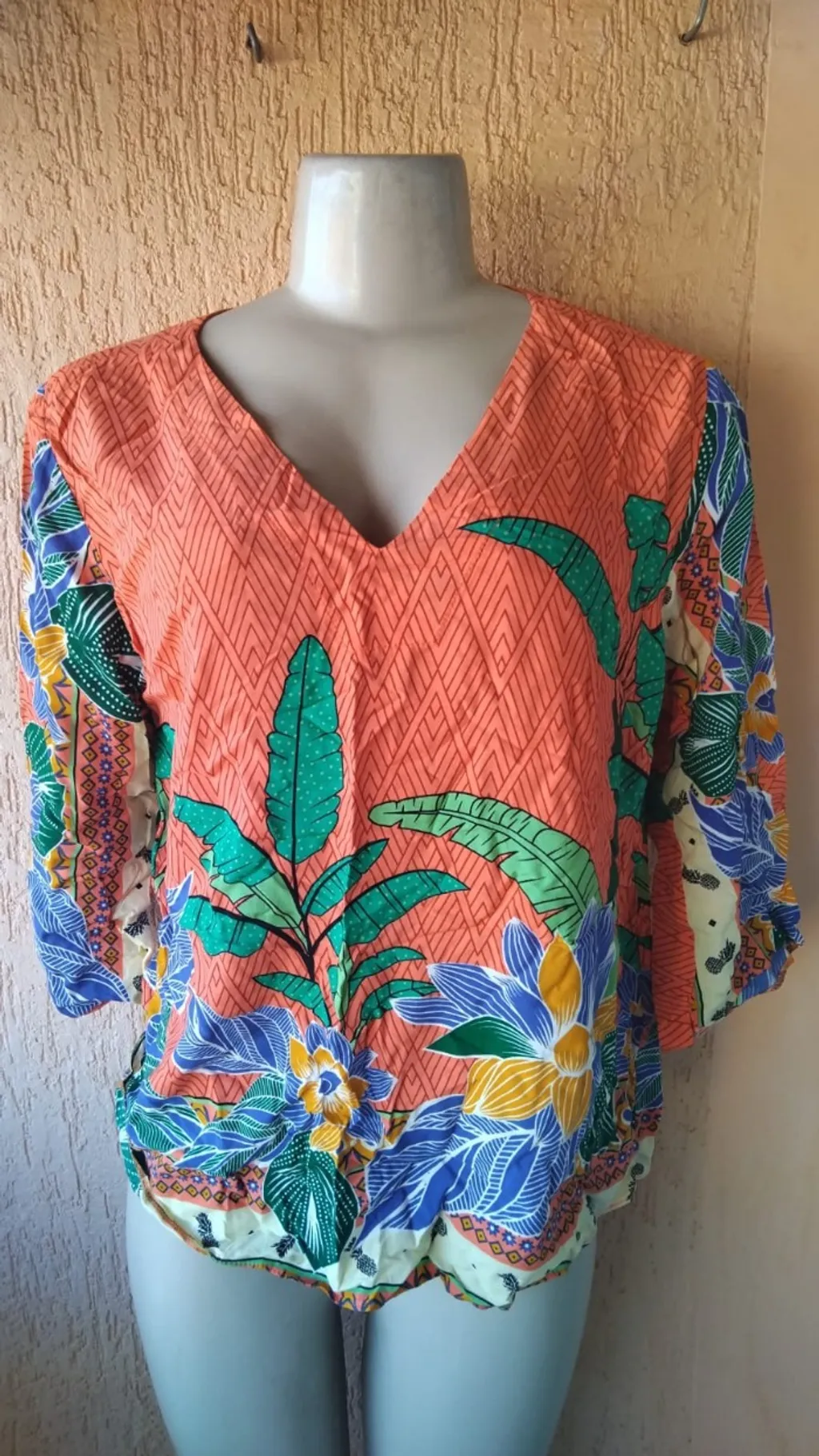 Linda camisa estilo bata com estampa tropical vibrante, ideal para composições leves e modernas. Peça confeccionada em tecido fresco, com excelente caimento e acabamento de qualidade. Possui mangas 3/4 e um decote em V bem discreto, garantindo elegância e conforto para diversas ocasiões. Produto novo, nunca usado. Perfeita para combinar com jeans ou shorts. Aproveite essa peça única para renovar seu guarda-roupa com cor e estilo! ✨