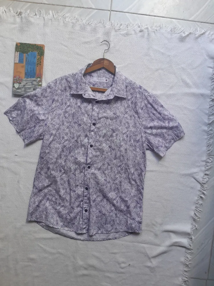 camisa masculina de manga curta, tamanho g, com estampa de folhas em tons de roxo e branco. possui botões pretos e é ideal para um look casual e confortável. peça usada em bom estado.