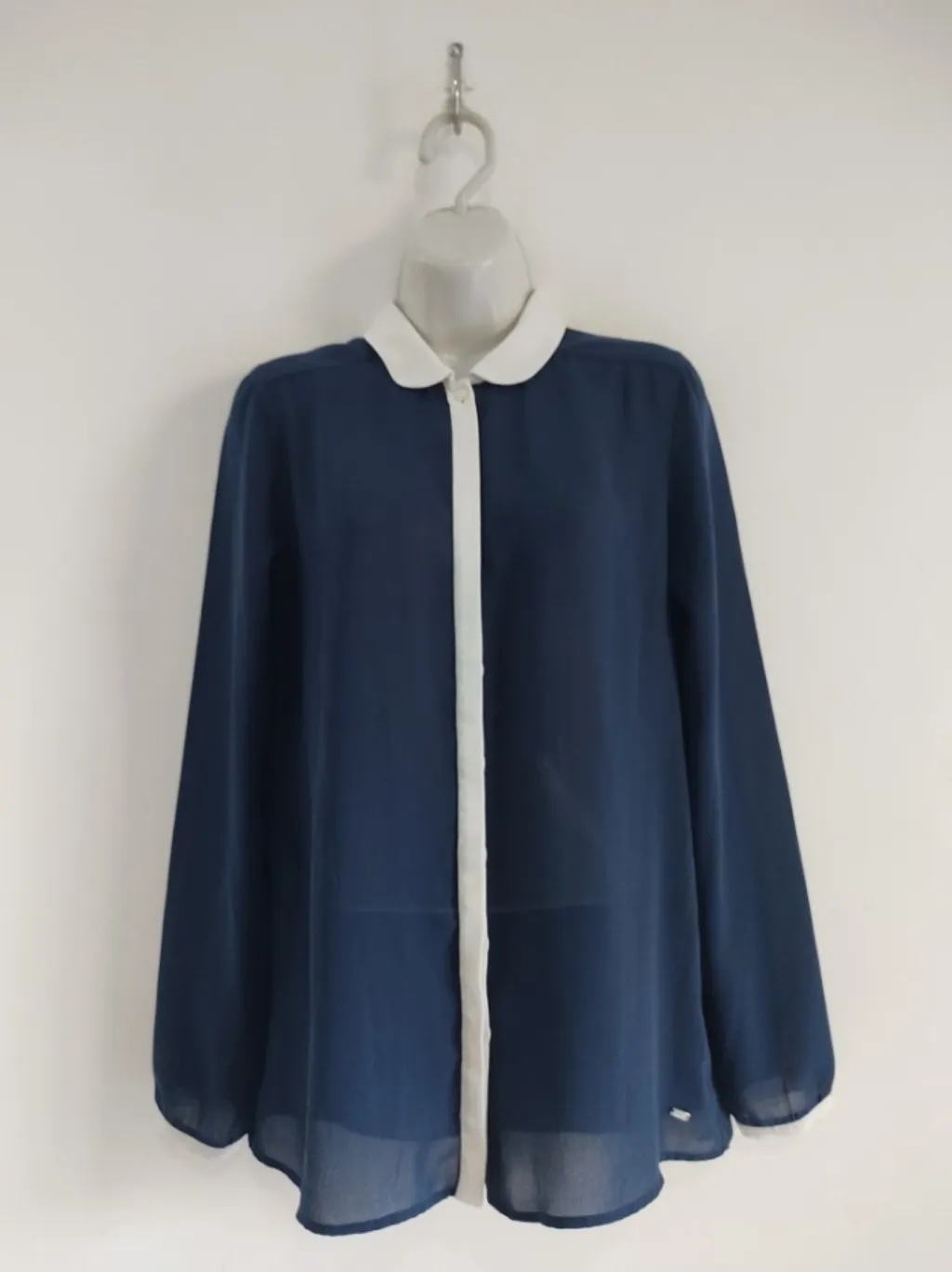 CONFIRA AS MEDIDAS ABAIXO: Possui gola clássica, fechamento com botões, manga longa e leve transparência. Usada, porém em excelente estado de conservação. Tamanho: M Cor: Azul marinho e branco Tecido: Poliéster Marca: Tommy Hilfiger Condição da peça: 10/10 Medidas: Busto: 100cm Cintura: 98cm Comprimento: 67cm Comprimento manga: 63cm