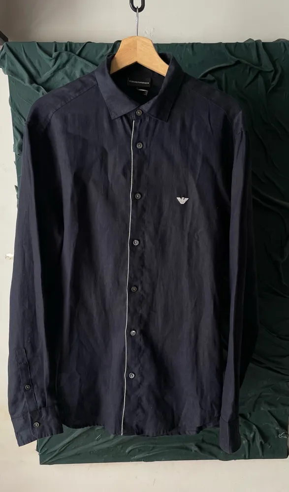 camisa masculina emporio armani, 100% linho, na cor preta. manga longa, tamanho g, com modelagem regular fit. peça em ótimo estado. medidas: tórax 114cm, cintura 112cm, ombro a ombro 50cm, manga 65cm, punho 22cm, comprimento 78cm.