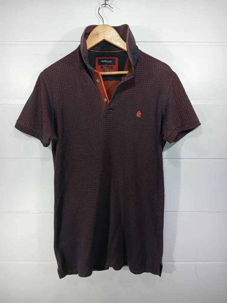 camisa polo mioche menswear, tamanho g, na cor marrom com detalhes em laranja. possui gola e vista com botões. peça semi-nova em excelente estado de conservação.