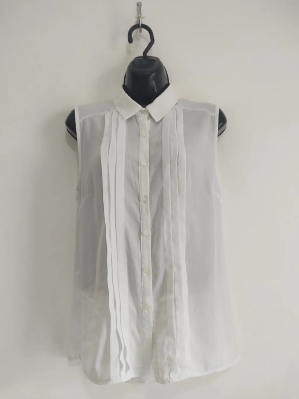 CONFIRA AS MEDIDAS ABAIXO: Possui gola clássica, fechamento com botões, detalhe drapeado frontal e decote nas costas. Usada, porém em excelente estado de conservação. Tamanho: M Cor: Branco Tecido: Poliéster Condição da peça: 10/10 Medidas: Busto: 100cm Cintura: 96cm Comprimento: 67cm
