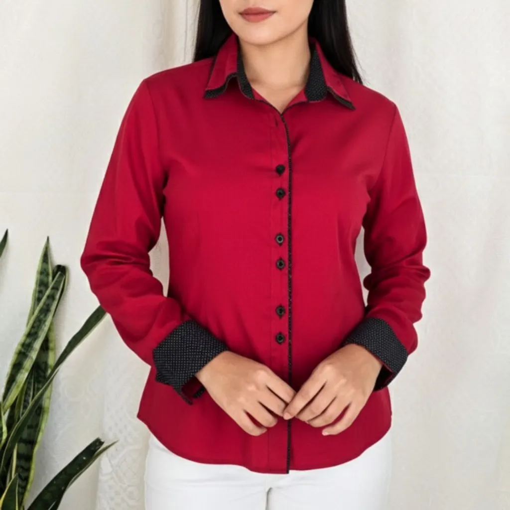 Camisa vermelha com detalhes preto poá, de tecido plano (parece misto de algodão e poliéster). Modelo com manga longa e abotoamento frontal e nos punhos. Sem etiquetas / Veste M / Condição 9/10. 41cm ombro a ombro, 94cm busto, 63cm manga e 59cm comprimento.