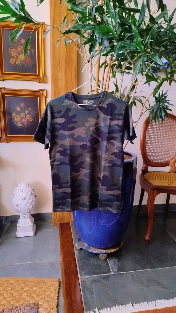 Camiseta camuflada pra quem gosta de básico com personalidade! ✨ Modelagem confortável + estampa que já faz o look. Daquelas que você coloca e não precisa pensar muito! 🤎 Por ser uma camiseta com tecido mais grosso, é perfeita para o friozinho que se aproxima! Marca: Marfinno Tamanho: P Medidas: 91 cm (busto); 66 cm (comprimento) Composição: 100% algodão Pouquíssimo usada, em perfeito estado de conservação!