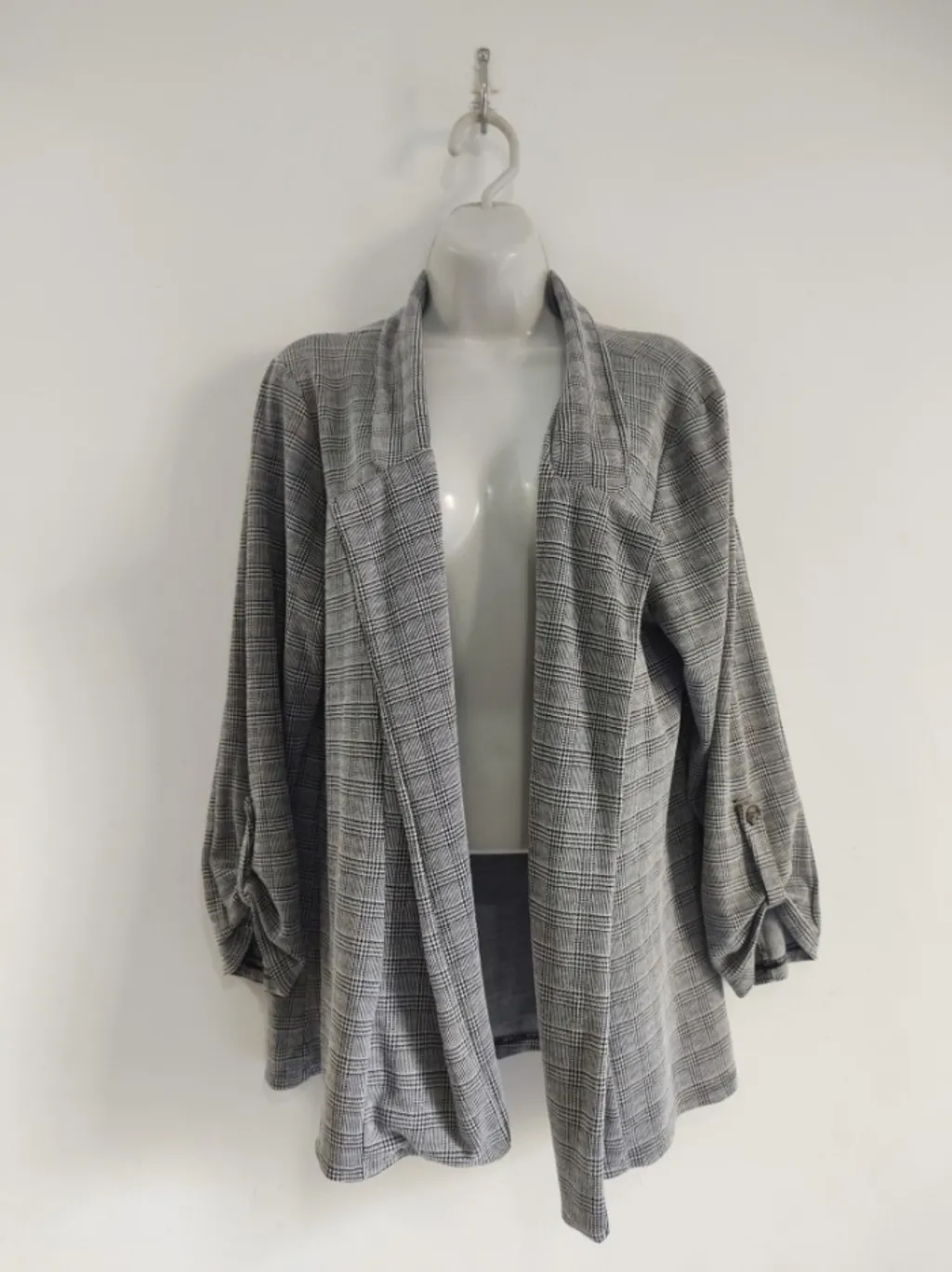 CONFIRA AS MEDIDAS ABAIXO: Modelo aberto, possui gola lapela, mangas 7/8 e estampa xadrez. Usado, porém em excelente estado de conservação. Tamanho: G3 Cor: Cinza e preto Tecido: Poliéster, viscose e elastano Marca: Feita Pra Mim Condição da peça: 10/10 Medidas: Busto: 128cm Cintura: 118cm Comprimento: 70cm Comprimento manga: 55cm