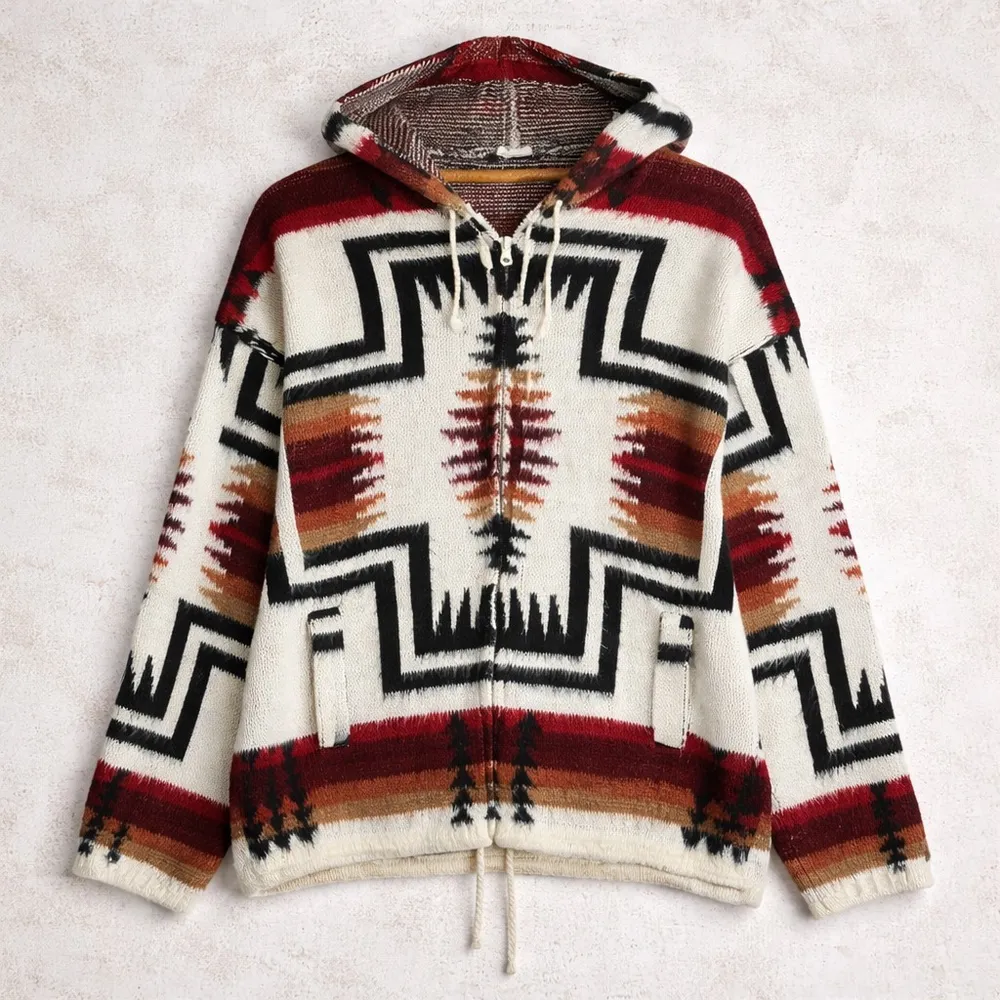 casaco oversized estampado estilo étnico/tribal 🌍 vibe anos 90 total! peça unissex, bem quentinha, com capuz, zíper e bolsos. tamanho g (modelagem ampla). altura 73 cm, largura 65 cm, ombro a ombro 66 cm, manga 58 cm. tecido tipo acrílico felpudo. tem leves bolinhas, mas no geral está ótimo. pronto pra usar ✨ estiloso demais!