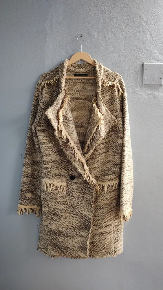Casaco para dias frios, tricô bem estruturado, longo (abaixo do bumbum) com bolsos. veste G/GG